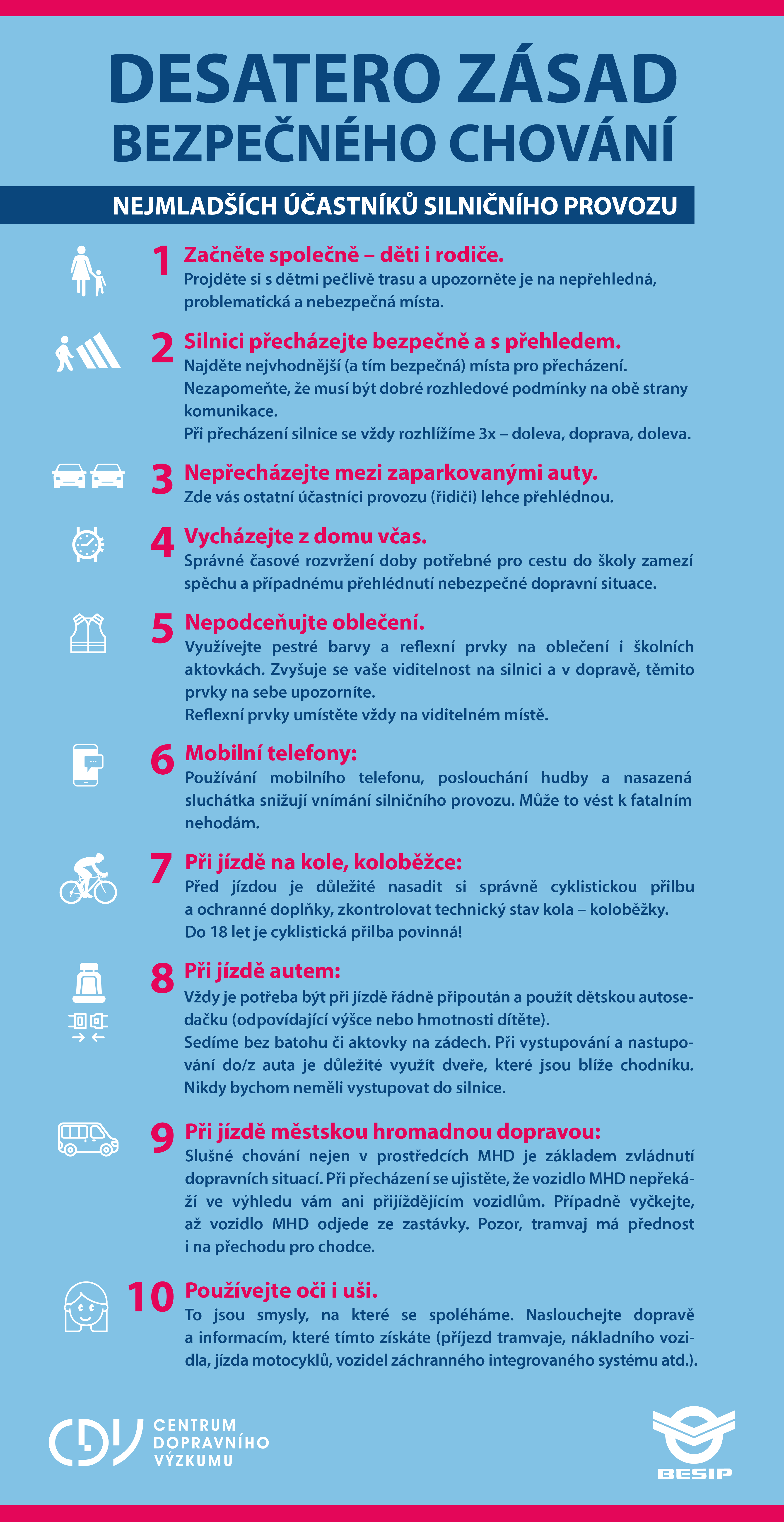 „Řidiči by ve středu i v dalších dnech nového školního roku měli být obzvlášť opatrní v okolí škol a v obytných oblastech, soustředit se stoprocentně na řízení a preventivně zpomalit. Pokud snížím v okolí školy rychlost na 30 km/h, riziko vážného zranění dětí bude minimální. Naopak i při padesátikilometrové rychlosti potřebuji k zastavení na suchém povrchu skoro 30 metrů a z toho prvních 15 vozidlo nezpomaluje, protože nikdo nedokáže reagovat na pohyb chodce ve vozovce okamžitě,“ upozornil vedoucí oddělení BESIP Ministerstva dopravy Tomáš Neřold. K bezpečnému návratu dětí do škol mohou ale zásadně přispět i děti a rodiče. „V souvislosti se začátkem školního roku proto připomínáme 10 hlavních zásad bezpečného chování nejmladších účastníků silničního provozu, aby pro ně bylo zahájení nového školního roku bezpečné, ať už budou do školy chodit pěšky nebo jezdit na kole, autem nebo hromadnou dopravou,“ dodal Neřold.